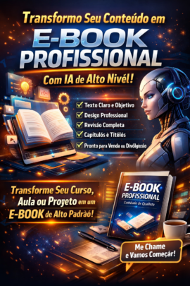 Você tem aulas, projetos, cursos, anotações, PDFs, vídeos ou conteúdos soltos e quer transformar tudo isso em um E-book profissional, organizado e pronto para vender ou divulgar?