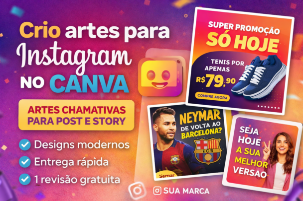 Crio artes no Canva que prendem a atenção e destacam seu conteúdo, seja para promoções, posts do dia a dia ou divulgação do seu negócio.