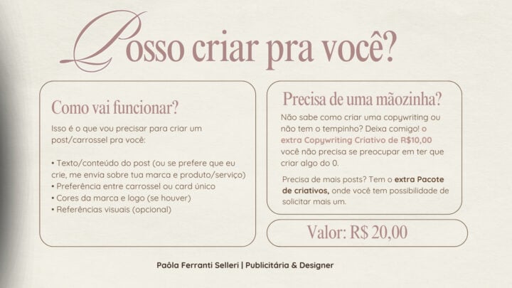 Transformo ideias em posts criativos para redes sociais, pensados para comunicar, organizar a informação e deixar o feed mais bonito. Crio artes personalizadas no formato que você preferir: carrossel ou card único, sempre respeitando a identidade da sua marca, suas cores e o seu objetivo. Gosto de layouts modernos, visuais bem resolvidos e detalhes que fazem a diferença.