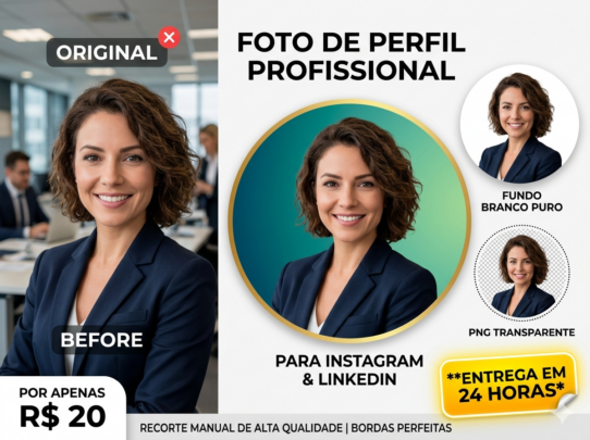 Transformo sua foto comum em uma imagem de autoridade para Instagram, LinkedIn, WhatsApp ou YouTube.Fundo Personalizado: Entrego em fundo transparente (PNG), branco puro ou com a cor de sua preferência para combinar com sua marca.Ajuste de Enquadramento: Centralização perfeita para o formato circular das redes sociais.