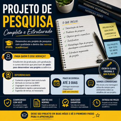 Desenvolvo projetos de pesquisa completos, organizados e alinhados às exigências acadêmicas.