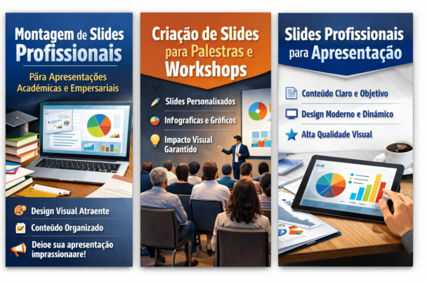 Ofereço serviços especializados de montagem de slides para apresentações acadêmicas, profissionais e workshops. A partir das informações, conteúdos e orientações que você fornecer, desenvolvo apresentações claras, organizadas e visualmente atrativas, adaptadas ao seu objetivo e público-alvo.