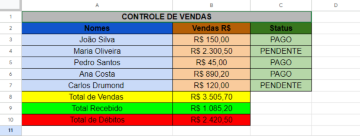 Criação de fórmulas automáticas (Total de Vendas, Recebido e Pendente).