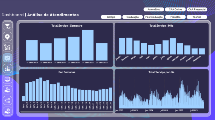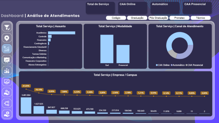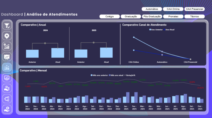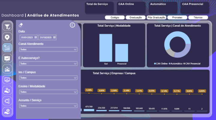 – Segmentação Total: Filtre por Campus, Modalidade (EAD/Presencial) e Canal de Atendimento.