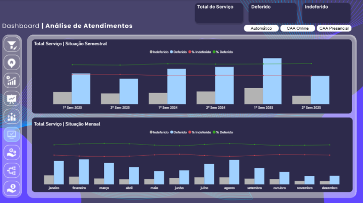 – Eficiência Operacional: Acompanhe taxas de Deferimento vs. Indeferimento em tempo real.