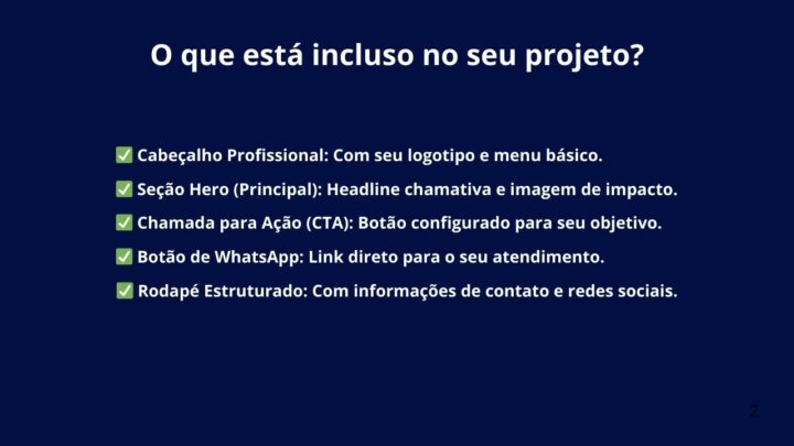 O que você recebe no pacote básico (R$ 50): Uma Landing Page de Dobra Única (Seção Hero). É a solução ideal para quem precisa de um “Cartão de Visitas Digital” ou uma página de captura direta e objetiva. Inclui: