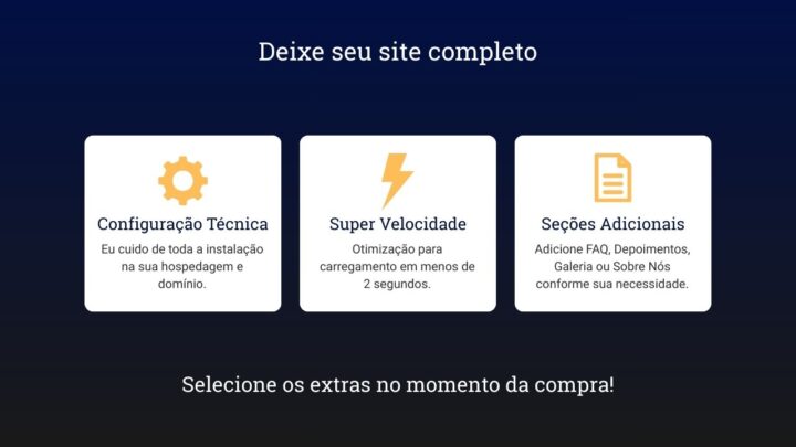 Quer uma página mais completa? Basta adicionar os extras de “Seção Adicional” para incluir Depoimentos, FAQ, Galeria de Fotos ou Sobre Nós.