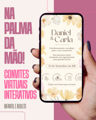 Faço o convite digital do seu evento! Além da economia do digital, personalizo seu convite com o tema da sua festa e todos os detalhes que você quiser! Também tenho a opção do convite interativo, onde temos botões onde os convidados podem clicar para confirmar presença, acessar a localização do evento e até acessar a lista de presentes caso tenha.
