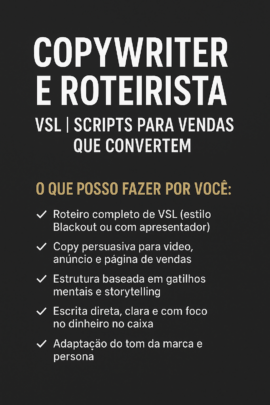 Eu sou copywriter e roteirista de VSL. Transformo ideias em scripts persuasivos que geram cliques, retenção e conversão real.