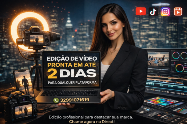 Edição de vídeos profissional para qualquer plataforma, rápida e com qualidade — Receba a primeira amostra do seu vídeo em até 1 dia útil, desenvolvida com atenção aos detalhes, ritmo profissional, cortes estratégicos e acabamento de alto padrão. Ideal para quem precisa de agilidade, mas não abre mão de um resultado moderno, envolvente e profissional.