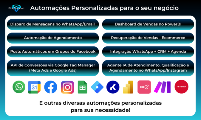 – Tenha automações específicas para suas necessidades, conectando suas ferramentas de trabalho (CRM, Gestão de Tarefas, WhatsApp, Email, Redes Sociais, Planilhas, Dashboards), diminuindo o tempo gasto nas tarefas e melhorando a qualidade do seu serviço