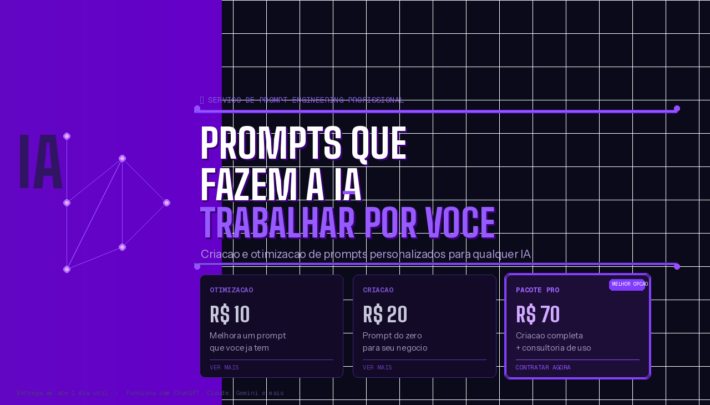 Aqui voce encontra criacao e otimizacao de prompts profissionais para qualquer ferramenta de inteligencia artificial, seja ChatGPT, Claude, Gemini, Copilot ou qualquer outra. Os prompts sao desenvolvidos de forma personalizada, levando em conta o seu nicho, o seu publico, o seu objetivo e a ferramenta que voce ja usa no dia a dia.