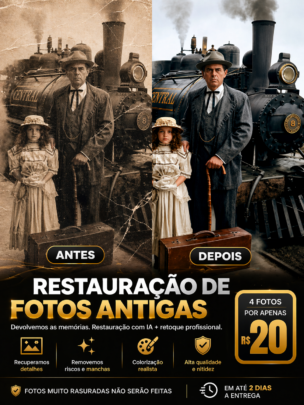 Restauro suas fotos antigas usando Inteligência Artificial, melhorando a qualidade e trazendo suas memórias de volta com mais nitidez.
