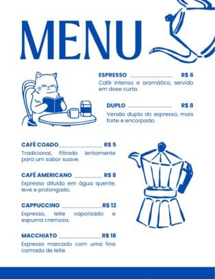 Eu irei montar e formatar o seu cardápio com um design bonito e limpo de acordo com a sua necessidade e seguindo sua preferência. Este anúncio cobre a confecção de um cardápio de até 4 paginas páginas (apenas frente). Também pode optar pelo cardápio digital. A compra inclui apenas o cardápio pronto em PDF para impressão, não realizo impressão e envio.