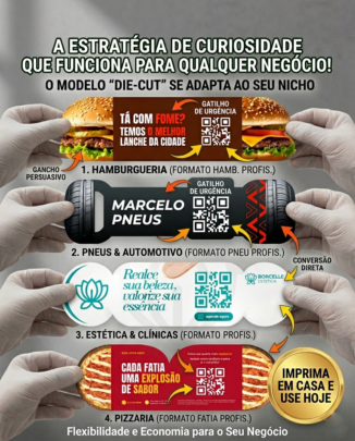 Artes exclusivas com faca de corte especial (Hambúrguer, Pizza, Pneu, Estética e muito mais) prontas para impressão. Você recebe o arquivo digital e pode imprimir em sua própria impressora.