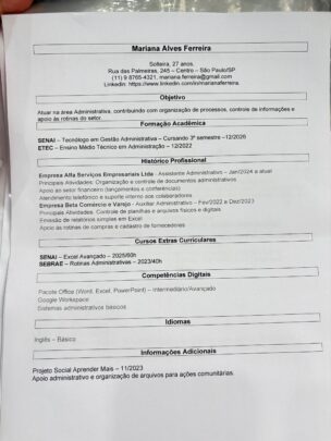 Sou formada em Recursos Humanos e ajudo profissionais a conquistarem mais entrevistas através de currículos bem estruturados, objetivos e alinhados ao que os recrutadores realmente procuram.