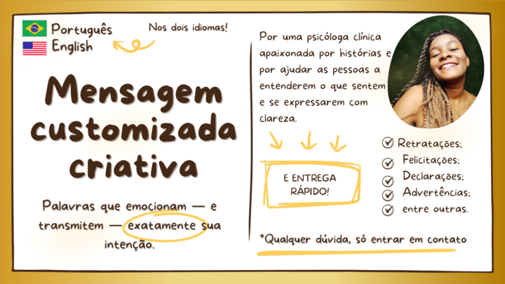 Sou psicóloga e palestrante, apaixonada por como as palavras podem confortar, inspirar e transformar. Neurodivergente e infinitamente curiosa, fui aquela criança que aprendeu a ler aos dois anos e que escrevia cartas de amor para as amigas entregarem como se fossem delas. E agora, junto com as habilidades que trago da prática clínica, posso ajudar naqueles momentos em que você quer dizer algo especial, mas não consegue encontrar as palavras certas. E vamos combinar, em tempos de IA, a sensibilidade humana não tem preço!