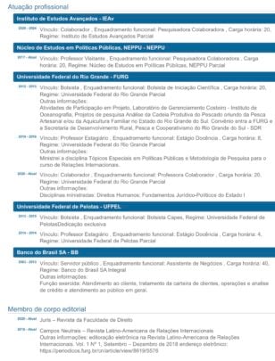 Pós-doutorado no Instituto de Estudos Avançados da Universidade de São Paulo (IEA/USP) onde trabalhou com a criação de “Indicadores de acesso à água potável para os municípios rurais de pequeno porte da Bacia Hidrográfica do Rio Piratini e Canal São Gonçalo sob a ótica do ODS 6 da Agenda 2030 (2020/2022), Doutora em Ciência Política pela Universidade Federal Fluminense – UFF (2019), Mestra em Ciência Política pela Universidade Federal de Pelotas – UFPEL (2015). MBA em Gestão de Negócios voltados as Desenvolvimento Regional Sustentável pela Universidade de Brasília – UNB (2009), Tecnóloga em Gestão Ambiental (2013) e Bacharel em Ciências Econômicas (2000) ambos cursados na Universidade Federal do Rio Grande – FURG. Atualmente cursa o 8 semestre do Bacharelado em Direito na Universidade São Francisco de Assis – FSFA em Porto Alegre (iniciado na Universidade Federal do Rio Grande FURF/RS). Atua principalmente nos seguintes temas: Políticas púbicas, Inclusão de pessoas com deficiência, pesquisa quantitativa e qualitativa, metodologia científica, criação de indicadores, sustentabilidade ambiental, qualidade das águas nos municípios, direito ambiental, Agenda 2030 e Direito Civil.