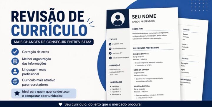 Eu reviso e ajusto seu currículo para deixá-lo mais claro, organizado e chamativo para recrutadores.