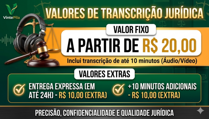 Valor: R$ 20,00 (transcrição de até 10 minutos de áudio/vídeo. Consulte para áudios mais longos).
