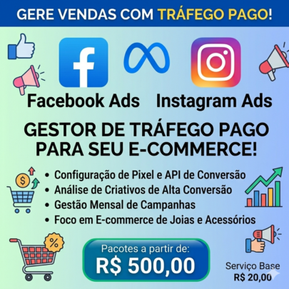 Você investe em anúncios, mas o retorno não vem? O segredo das grandes marcas é ter uma estratégia de Gestão de Tráfego Profissional. Eu ajudo negócios a escalarem suas vendas através de anúncios segmentados no Facebook e Instagram (Meta Ads).