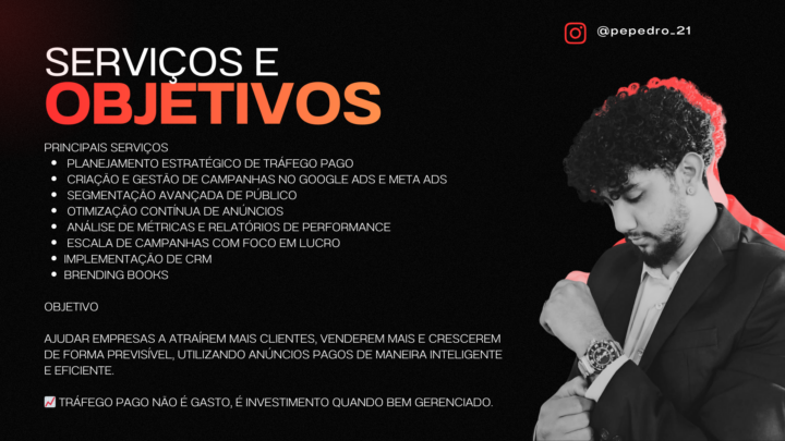 Sou gestor de tráfego pago focado em ajudar empresas a gerar mais visibilidade, leads e vendas através de anúncios estratégicos no Facebook Ads ou Google Ads.
