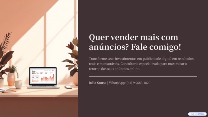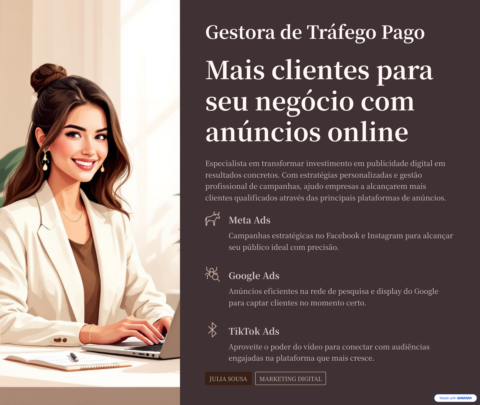 Sou Julia Sousa, gestora de tráfego pago. Ajudo empresas, e-commerces e prestadores de serviço a atrair mais clientes através de anúncios no Meta Ads, Google Ads e TikTok Ads. Trabalho com estratégias simples, bem estruturadas e acompanhamento constante, focando em organização, clareza e melhores resultados para o seu negócio. Ideal para quem quer começar a anunciar ou melhorar campanhas que não estão performando.