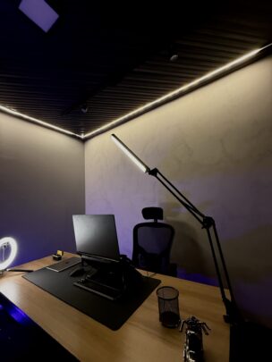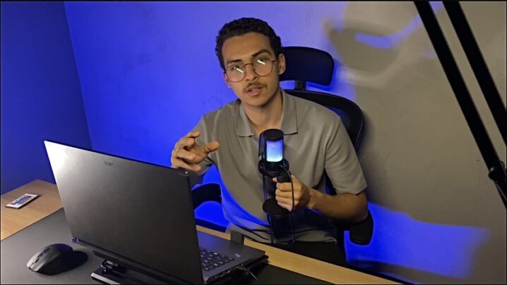 Uso de softbox e iluminação frontal, com luz de fundo personalizável (azul, vermelha, verde ou amarela), podendo ser escolhida conforme a identidade visual da sua marca ou estilo do vídeo.