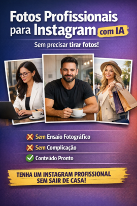 Crio fotos profissionais com Inteligência Artificial, totalmente personalizadas para o seu perfil — sem precisar de sessão fotográfica, câmera ou edição complicada.