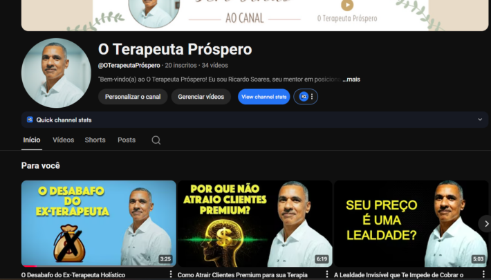 Eu configuro seu canal no YouTube com capa, descrição estratégica, palavras-chave, playlists e sugestões de vídeos iniciais. Ideal pra quem quer começar com o pé direito e já se posicionar como autoridade.