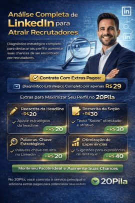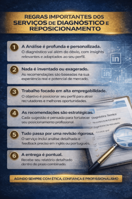 Eu realizo um diagnóstico estratégico completo do seu perfil com foco em posicionamento profissional, percepção de senioridade e potencial de empregabilidade.