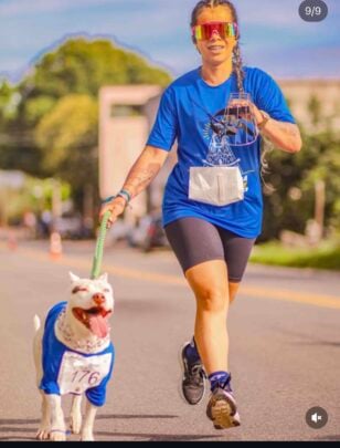 Gravo com cachorro pitbull de porte grande;
