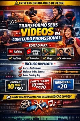 Eu transformo suas gravações brutas em vídeos dinâmicos, envolventes e que realmente prendem a atenção do público, aplicando técnicas e conhecimentos adquiridos com trabalho profissional na área para diversos tipos de conteúdo, de produção jornalística, inserções comerciais, gameplays e vlogs.