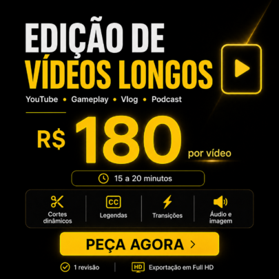Trabalho com vídeos de 15 a 20 minutos, ideal para canais de YouTube, gameplays, vlogs, vídeos explicativos, cortes maiores, podcasts editados e conteúdos para redes sociais.