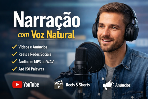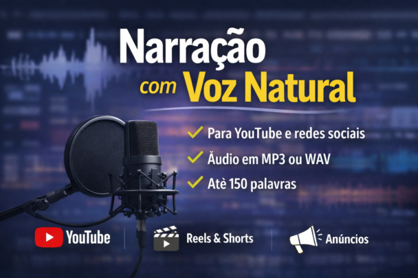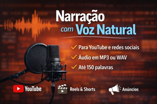 O áudio é gravado com boa clareza e entregue em arquivo MP3 ou WAV, pronto para ser utilizado no seu projeto.