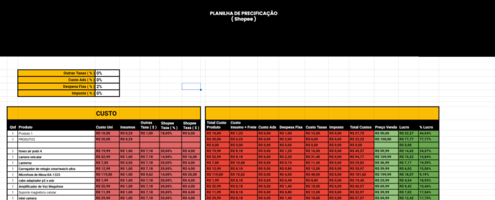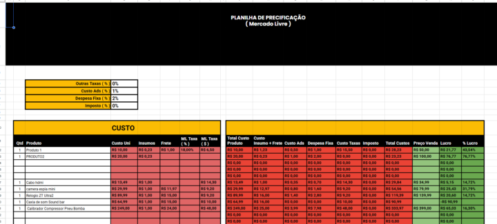 A planilha é desenvolvida para calcular automaticamente todos os custos envolvidos na venda, como taxas da plataforma, frete, custo do produto e margem de lucro, garantindo que você nunca venda no prejuízo.