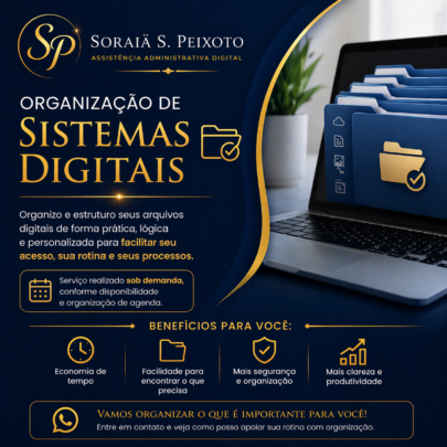 Organizo e estruturo sistemas digitais e arquivos de forma prática, lógica e funcional, facilitando o acesso às informações e aumentando a produtividade no dia a dia.