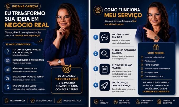 Eu organizo sua ideia de negócio de forma simples, clara e prática.