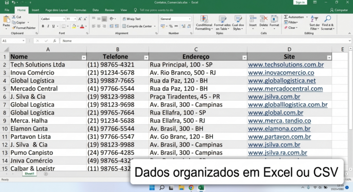 Arquivo organizado em Excel (.xlsx) ou CSV.