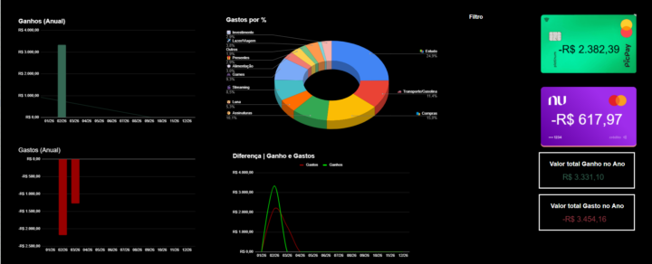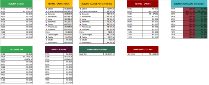 Com base nesse modelo, vou criar uma planilha de gastos para acompanhamento mensal, com um dashboard anual incluso na planilha. Você pode controlar seus gastos e ganhos para melhor controle da sua vida financeira