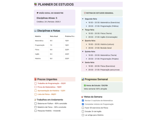 Quer colocar sua vida nos trilhos, mas não sabe por onde começar? Eu crio planners totalmente personalizados, pensados para sua rotina, suas metas e seu estilo. Seja para estudar, treinar, organizar finanças, controlar hábitos, planejar projetos ou simplificar o dia a dia, eu preparo um planner único, que funciona de verdade para você.