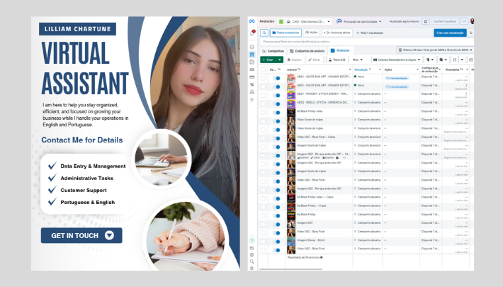Sou Engenheira e Pesquisadora, especialista em resolver problemas com agilidade. Entrego soluções em Design (Logos/Artes), Organização de Dados (Planilhas/Dashboards) e Suporte Administrativo. Trabalho com foco em prazos curtos, organização técnica e máxima qualidade. O que você precisa resolver hoje?