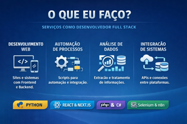 Sou desenvolvedor Full Stack formado em Ciência da Computação pela UNIR, com experiência em desenvolvimento web, automação de processos e manipulação de dados. Já atuei em órgãos públicos criando soluções que reduziram tarefas manuais e aumentaram a eficiência operacional, principalmente através de automações com Python e Selenium e integração com bancos de dados como PostgreSQL.