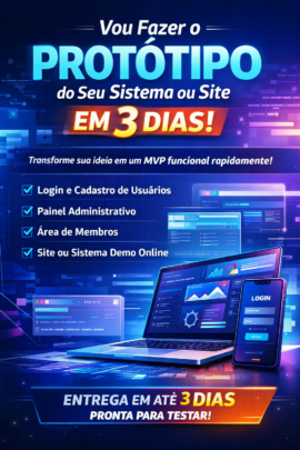 Eu desenvolvo o protótipo funcional do seu projeto em até 3 dias, com estrutura real de backend e organização profissional — ideal para validar sua ideia, apresentar para investidores ou iniciar vendas.