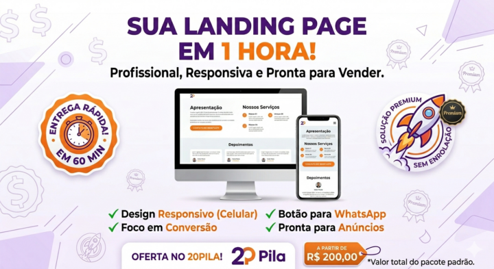Vou criar uma landing page profissional para o seu negócio em até 1 hora, pronta para receber visitas, gerar contatos e passar credibilidade para quem te encontrar online.