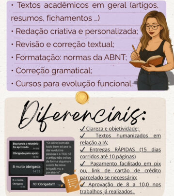 Sou professora de língua portuguesa e escrevo muito bem. Tenho condições de te auxiliar na escrita, correção, digitação, apresentação e outros de um projeto, artigo, currículo, comunicado e demais trabalhos no campo da escrita.
