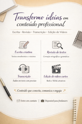 Sou editora de vídeos verticais especializada em conteúdos dinâmicos e envolventes para Reels e TikTok. Trabalho com cortes estratégicos, ritmo alinhado com tendências, legendas atrativas e efeitos que prendem a atenção do público desde os primeiros segundos. Tenho olhar criativo e sensibilidade para transformar ideias simples em vídeos impactantes, sempre buscando destacar a identidade de cada cliente. Se você precisa de vídeos modernos, que engajam e conversam com o público atual, posso te ajudar a alcançar esse resultado.