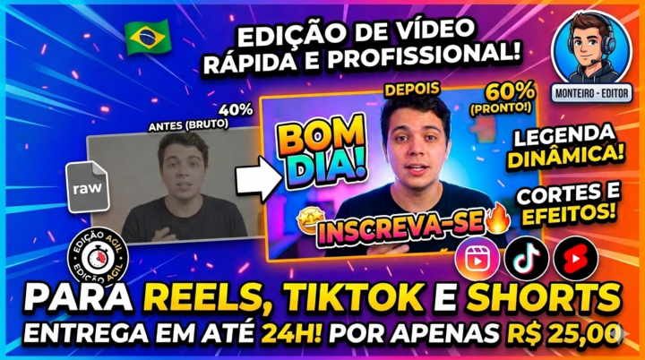 Precisa de agilidade? Eu edito seu vídeo para Instagram, TikTok ou YouTube Shorts. Faço os cortes necessários, coloco uma trilha sonora bacana e entrego em tempo recorde.