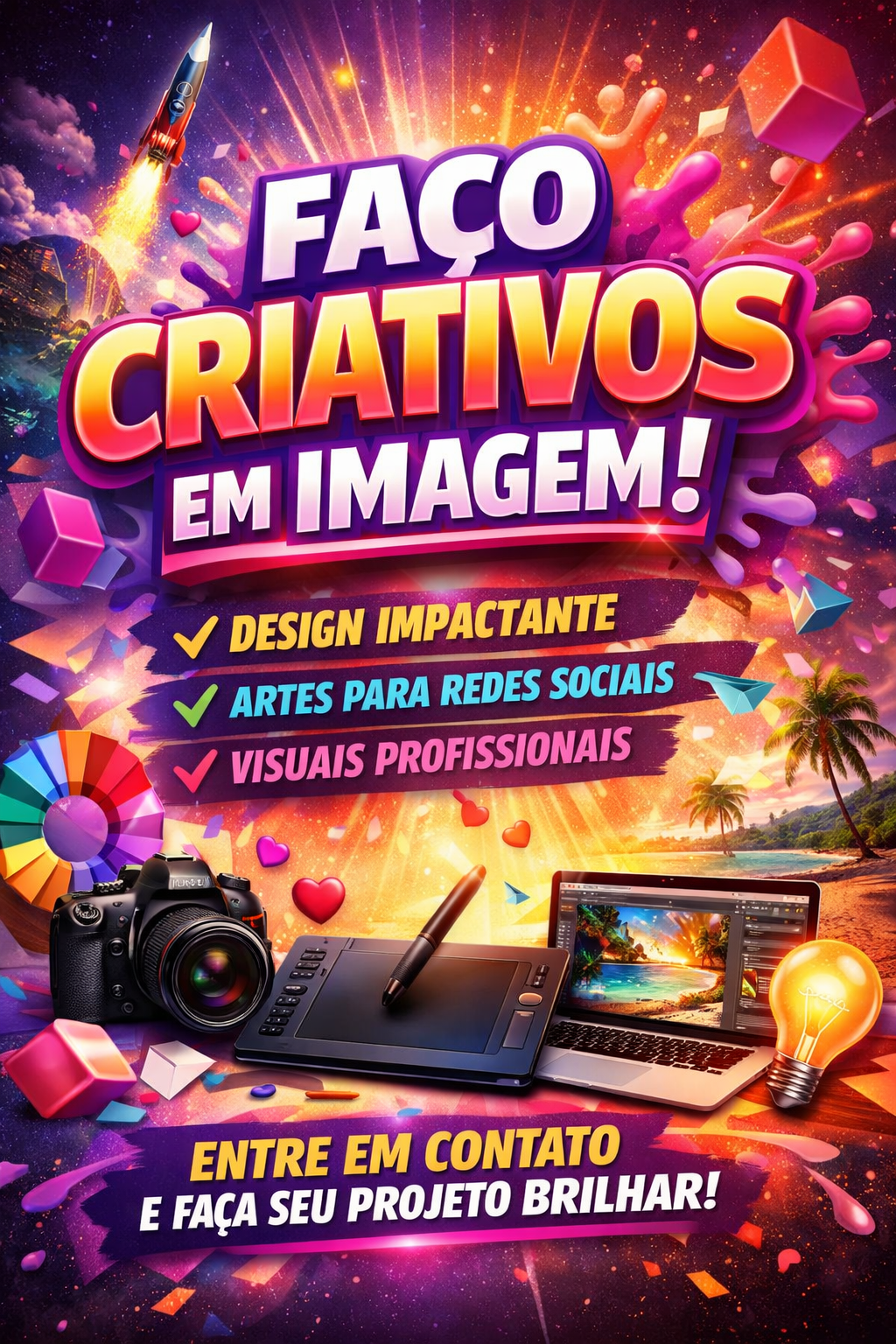 Transformo ideias em artes visuais criativas e profissionais. Trabalho com criação de designs personalizados, desenvolvendo banners, cartões, convites e artes digitais que chamam atenção e valorizam sua marca ou evento.
