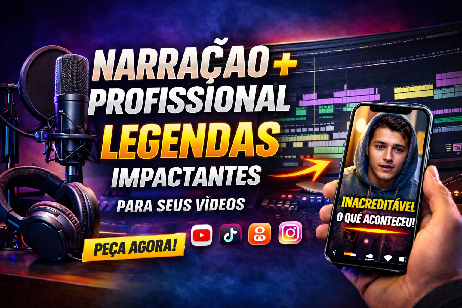 Se você quer aumentar retenção, prender a atenção nos primeiros segundos e deixar seu conteúdo com cara de canal grande, você está no lugar certo. Eu ofereço narração profissional envolvente e legendagem estratégica para vídeos do YouTube, TikTok, Kwai, Instagram e Facebook.